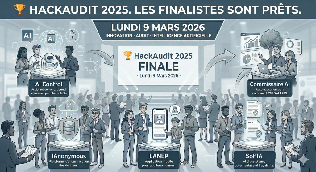 Rejoignez les commissaires aux comptes, mentors et partenaires le lundi 9 mars 2026 pour la grande finale du HackAudit 2025.